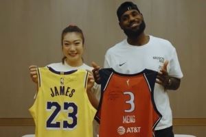 詹姆斯与李梦亲切交流,互赠礼物。李梦送给詹姆斯一个成都的吉祥物“花花”玩偶,詹姆斯回赠李梦签名球衣和球鞋,两人还互换球衣并合影。