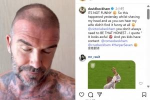 贝克汉姆晒出了自己理发后的动态,一块“斑秃”过于明显。他对此表示:“一点不好笑 昨天剃头翻车现场——如你所闻,我老婆的吐槽堪称无情 @维多利亚,实话实说也要分场合!原话引用:‘丑爆了’ 很好,孩子们又有新笑料了”