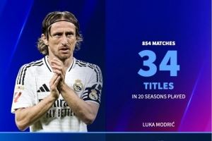 莫德里奇:39岁,身价400万。20个赛季,854场,34冠